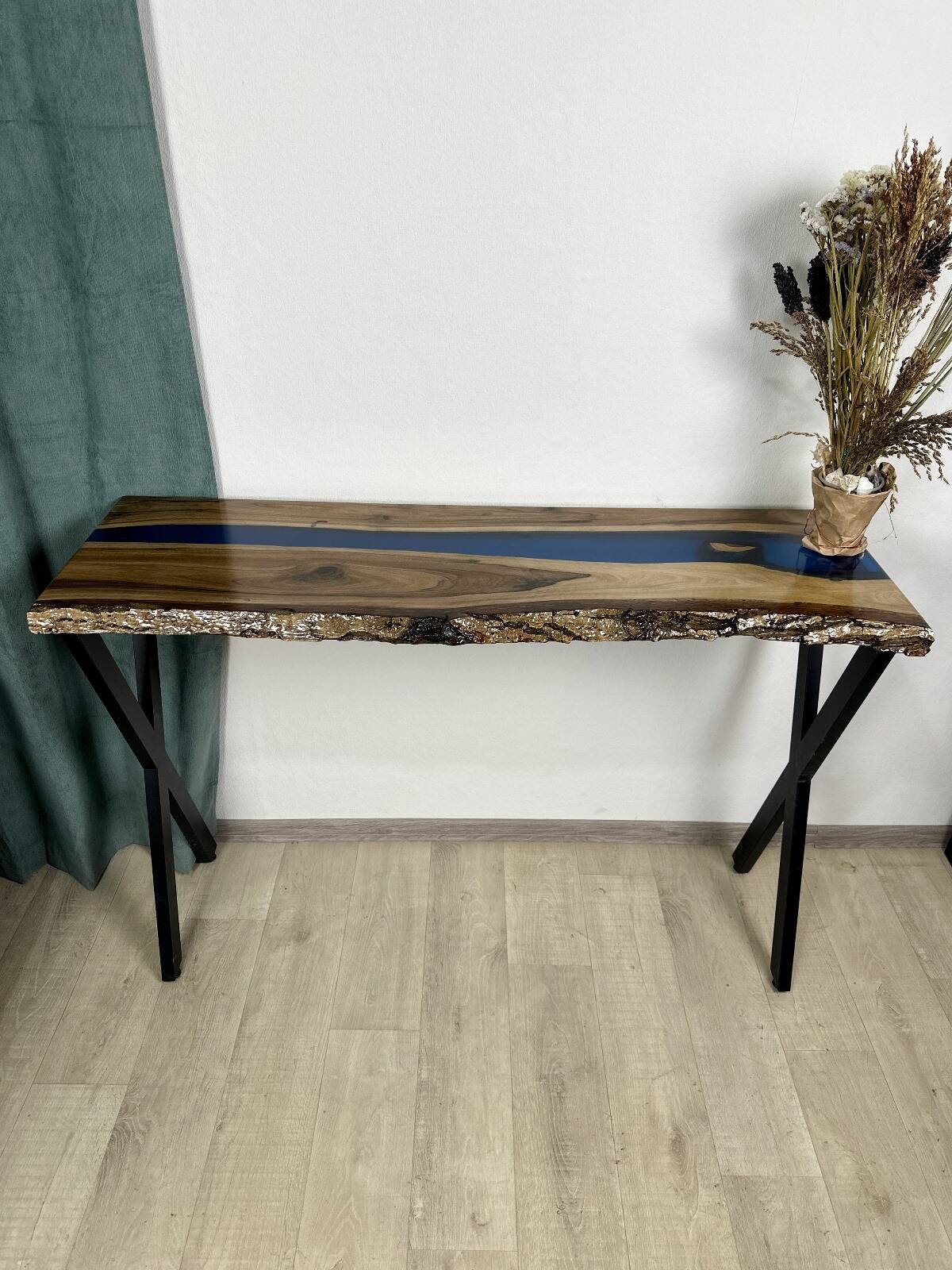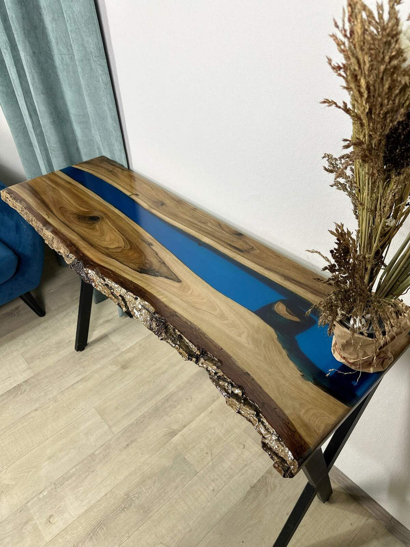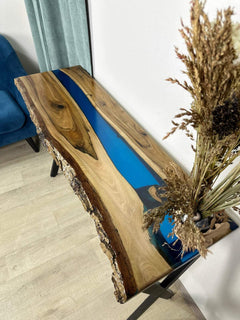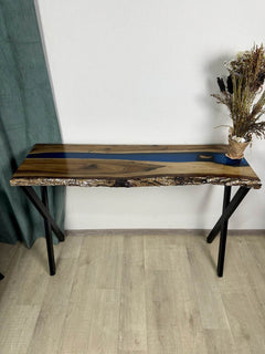The Azure Flow Walnut Console is a stunning blend of natural elegance and modern design. Crafted from premium walnut wood, its rich grain is highlighted by a vibrant blue epoxy river that flows through the tabletop, evoking a sense of tranquility and artistry. Perfect for entryways, hallways, or living spaces, this console table offers both functionality and visual appeal. With sleek, sturdy legs and a smooth finish, it’s a timeless piece that adds sophistication and charm to any decor.