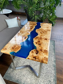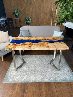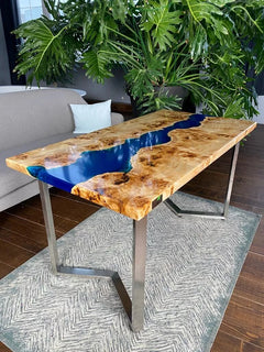 The Azure River Poplar Table is a masterpiece of nature and craftsmanship. Featuring rich, natural poplar wood with stunning grain patterns, its design is elevated by a striking blue epoxy river flowing through the center, resembling a tranquil waterway. The table’s sleek, contemporary legs provide a modern touch, making it a perfect statement piece for any living space. Built to last with premium materials, this unique table is as functional as it is artistic, bringing elegance and serenity to your home.