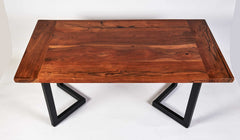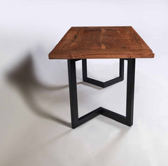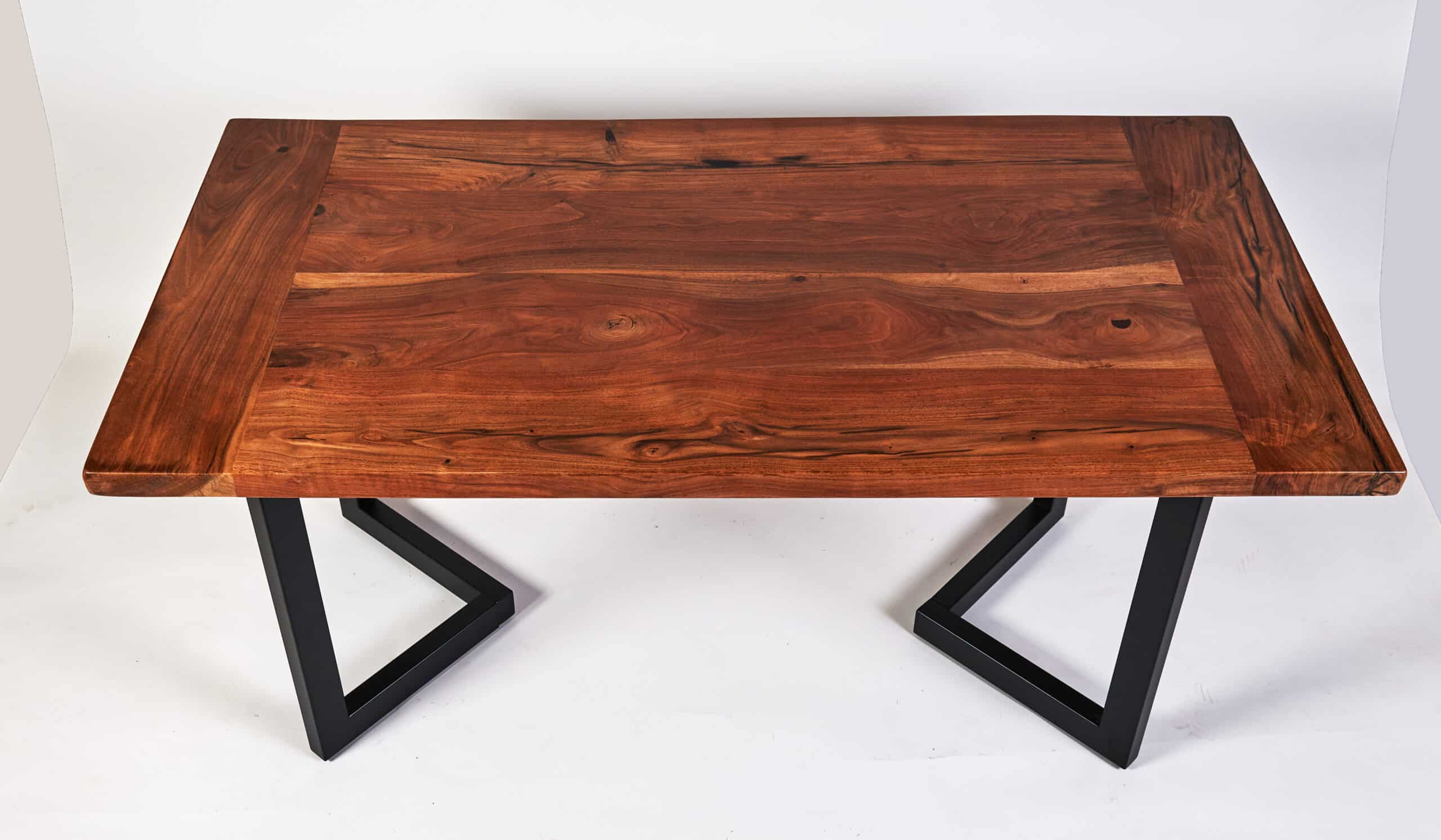No stains are needed, the coloring is all-natural. Supporting the table is a custom-made steel H style leg base or you can choose another style. The table features a highly figured section of the tree and a nice balance of heartwood and sapwood. The wood has been dried, leveled, sanded, cleaned, and finished with a protective matte finish.