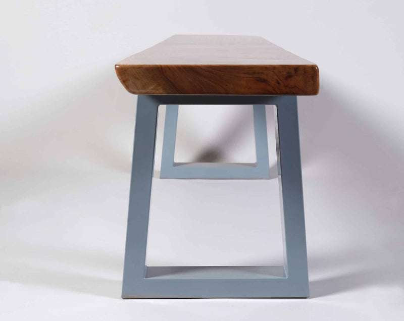 No stains are needed, the coloring is all-natural. Supporting the table is a custom-made steel bench-style leg base or you can choose another style. The piece can function for a variety of needs depending on the space it’s in. Solid enough to use as a bench, great for a small coffee table in a small apartment, and could also serve as an accent table along the side of a sofa.