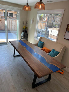 Discover the perfect balance of nature and artistry with our Live Edge Black Walnut Table. Adorned with a captivating blue epoxy river, choose between a sleek matte or a luxurious glossy finish. This table seamlessly blends organic charm with contemporary design, creating a functional masterpiece that complements any space with its unique beauty and style.