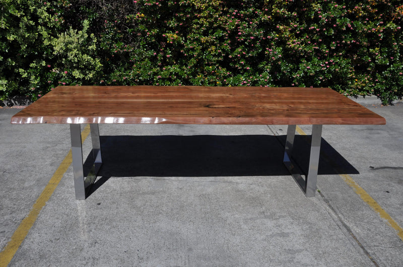Discover our Live Edge Black Walnut Dining Table, designed to modernize any office space, from vibrant startups to established businesses. This centerpiece boasts a captivating epoxy resin river, embodying the tranquility of nature and promoting a creative flow of ideas. Comfortably seating up to ten, its sleek design and customizable steel trapezoid legs ensure a perfect fit for your workspace ambiance.