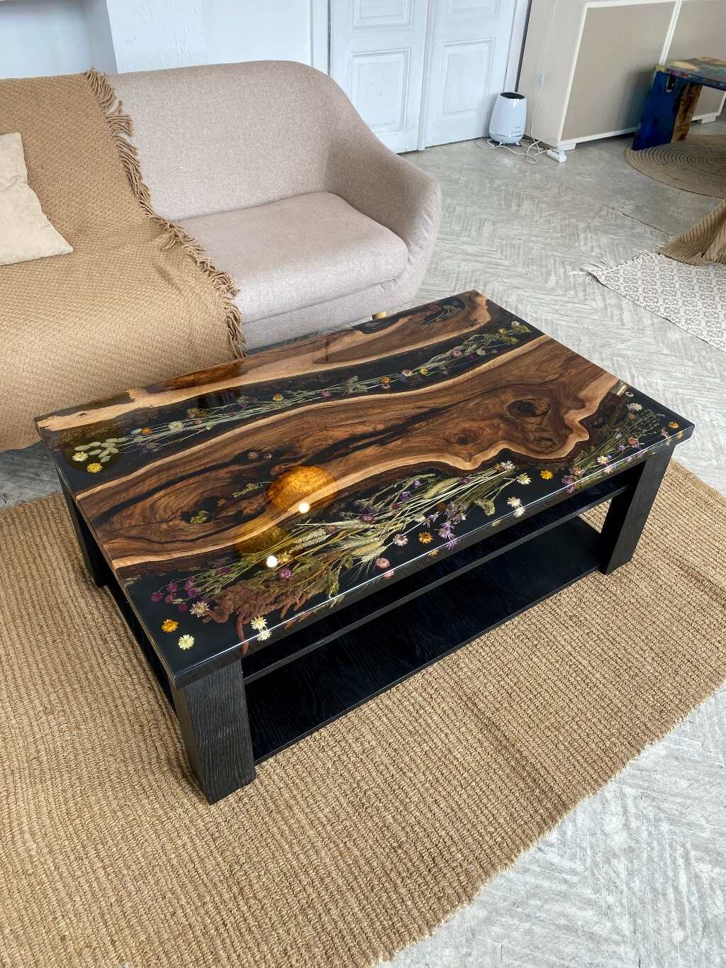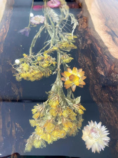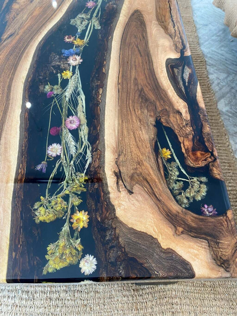 The Blooming Grove River Table is a stunning blend of natural walnut wood and delicate preserved flowers set in crystal-clear epoxy, creating a one-of-a-kind piece. The live-edge walnut showcases its rich grain, while the floral accents add a vibrant, whimsical touch, resembling a blooming garden. Perfect for dining or accent spaces, this table brings the beauty of nature indoors, making it a captivating centerpiece that combines rustic charm and artistic elegance in any modern or rustic setting.