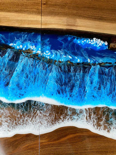 Introducing the Ocean Crest Walnut Side Table, a captivating blend of natural beauty and contemporary design. This stunning piece showcases a live edge walnut top, revealing the rich grain and unique contours of the wood. The striking blue epoxy river flows through the table, evoking the mesmerizing movement of ocean waves. Perfectly sized for a sofa side or as a nightstand, this table brings elegance to any space. Each table is handcrafted, ensuring that your piece is one-of-a-kind, making it a standout addition to your home decor. Elevate your living space with this exquisite blend of nature and artistry!
