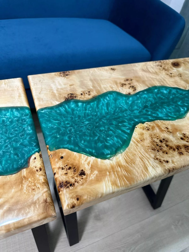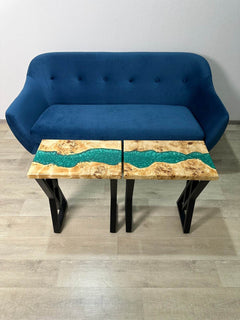 Transform your bedroom with the stunning Emerald Stream Duo Tables. This set of two bedside tables showcases the natural beauty of poplar wood, complemented by vibrant green epoxy resin rivers that flow through their surfaces, evoking a sense of tranquility. Each piece is handcrafted to highlight the unique grain and texture of the wood, ensuring no two tables are alike. Supported by sleek black metal legs, these tables are both sturdy and stylish, perfect for adding a touch of modern elegance to any space.