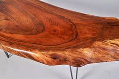 Available for sale this live edge black walnut coffee table. Made with uniquely figured solid black walnut slabs, the desk showcases why walnut is one of the most sought-after woods for furniture use.