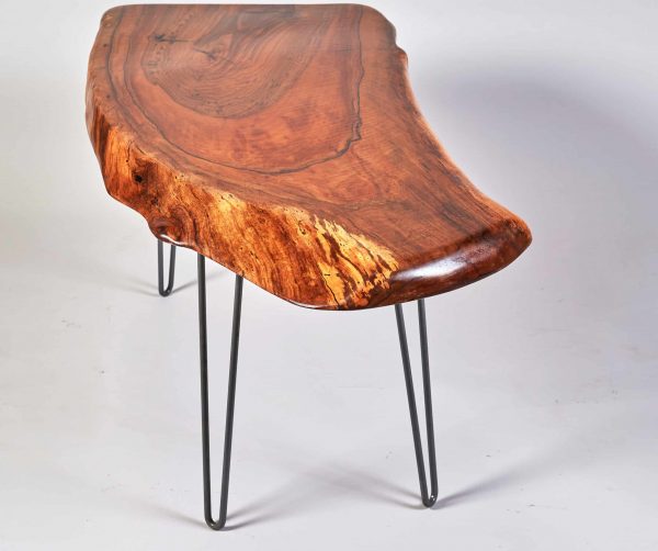No stains needed, the coloring is all-natural. Supporting the table are custom-made steel hairpin style legs or you can choose another style. The table features a highly figured section of the tree and a nice balance of heartwood and sapwood. The wood has been dried, leveled, sanded, cleaned, and finished with a protective matte finish.