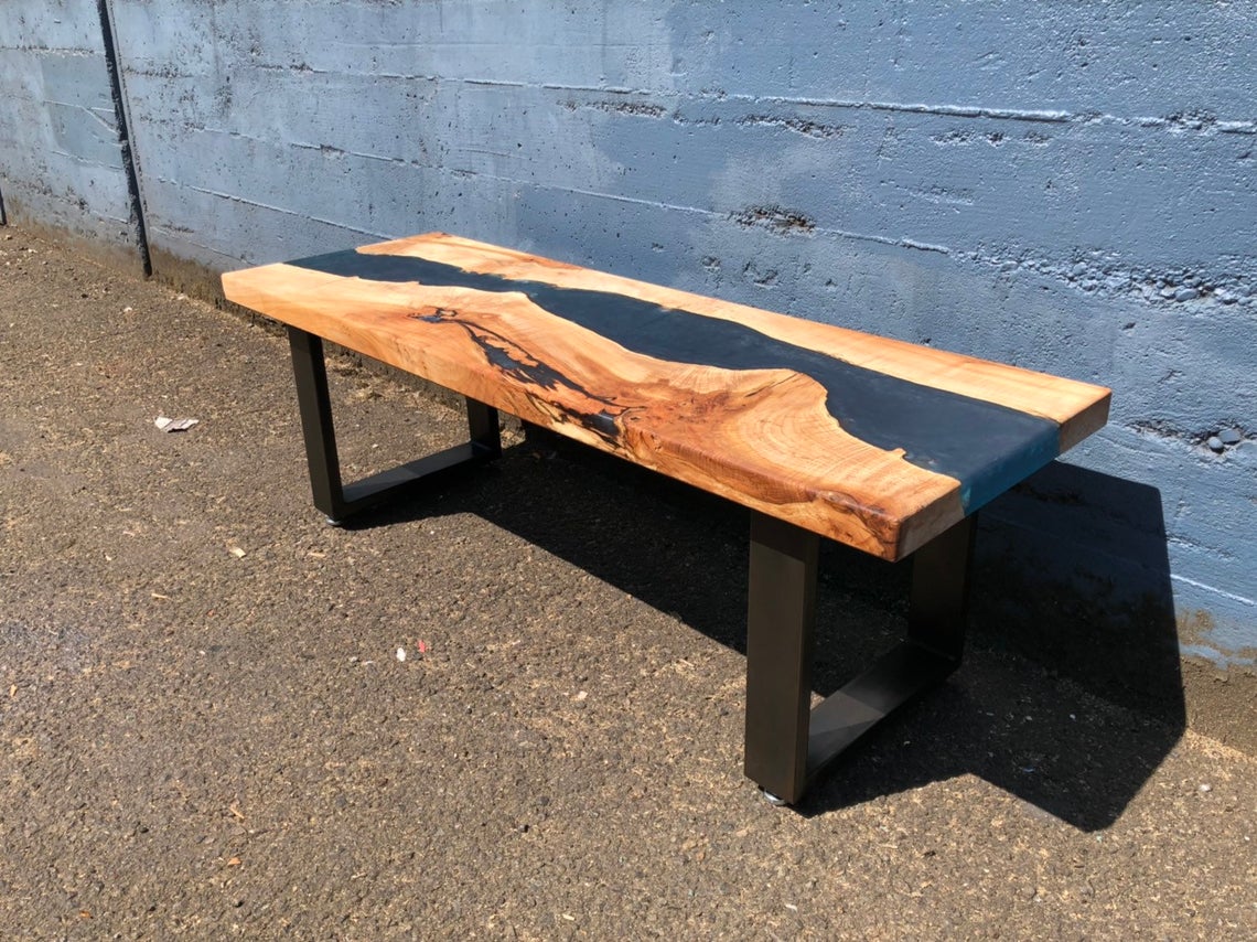 This beautiful waterfall bench is made from Maple and Epoxy resin. The epoxy features a matte metallic base. If you’re looking for a unique live edge epoxy river bench, this walnut beautiful bench is for you.