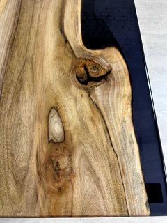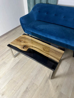The Midnight River Walnut Coffee Table combines the natural beauty of walnut wood with a striking black epoxy river design. The rich, dark tones of the walnut are beautifully complemented by the sleek black epoxy, creating a bold contrast that enhances any living space. Each piece is meticulously crafted for durability and style, with a smooth finish that highlights the unique grain patterns of the wood. This coffee table is perfect for adding sophistication and character to your modern home decor.