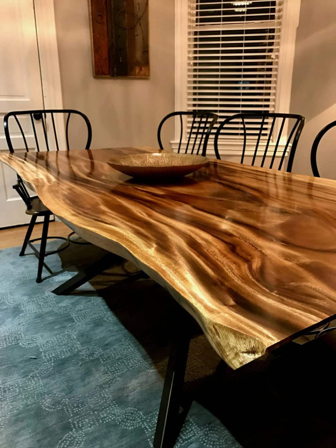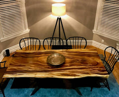 The Monkey Pod Dining Room table made of solid wood and epoxy resin comfortably seats 6 to 8 people. Quality craftsmanship by Maxiwoods emphasizes the natural imperfections and beauty of the natural wood slab.