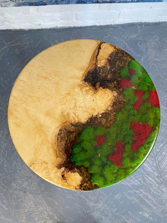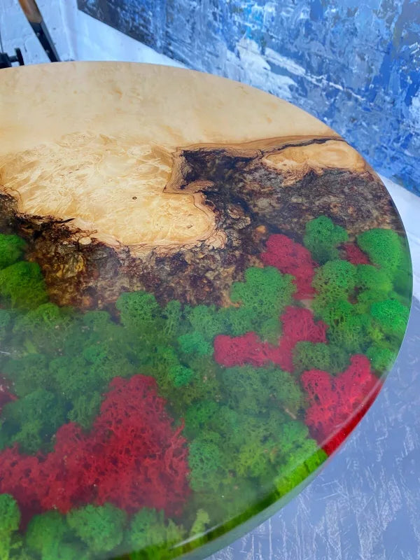 The Mossy Grove Round Table is a captivating fusion of natural wood and vibrant epoxy, designed to bring the serenity of nature into your home. Featuring a lush green and red moss-inspired epoxy design, this table evokes the beauty of a forest floor, complemented by the warmth and elegance of natural wood grain. Its handcrafted quality and sturdy construction make it both functional and artistic. Perfect for living rooms, offices, or creative spaces, this table is a true centerpiece of natural charm.