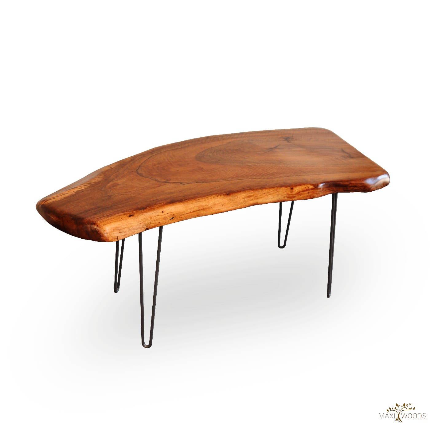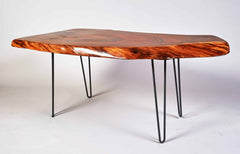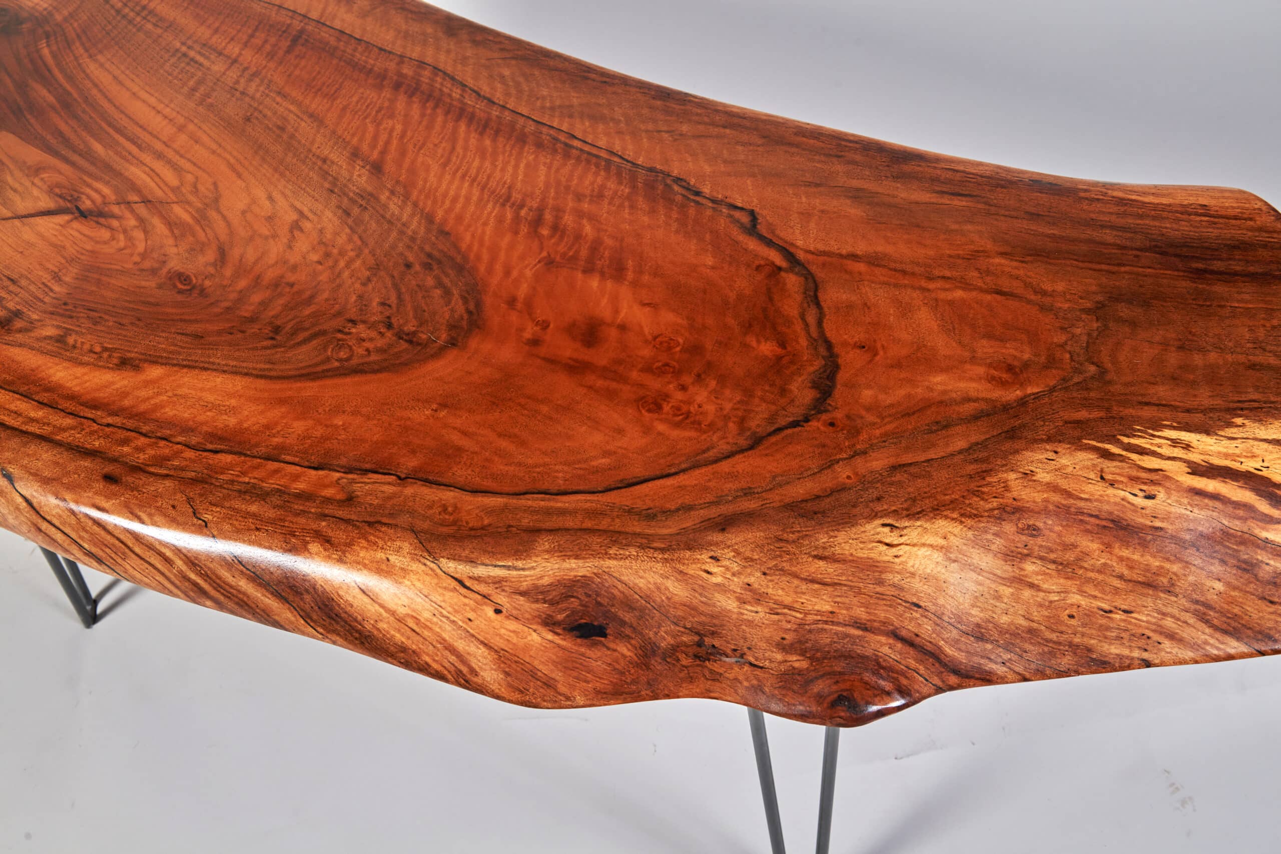 No stains needed, the coloring is all-natural. Supporting the table are custom-made steel hairpin style legs or you can choose another style. The table features a highly figured section of the tree and a nice balance of heartwood and sapwood. The wood has been dried, leveled, sanded, cleaned, and finished with a protective matte finish.