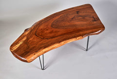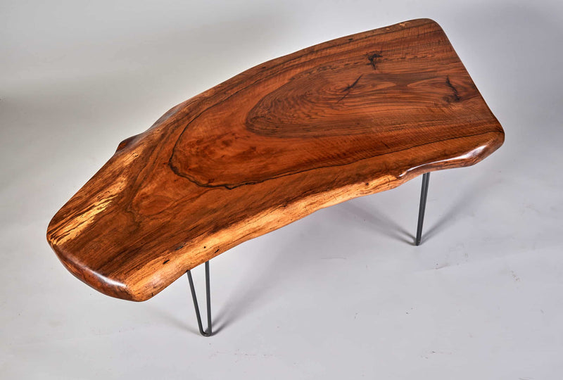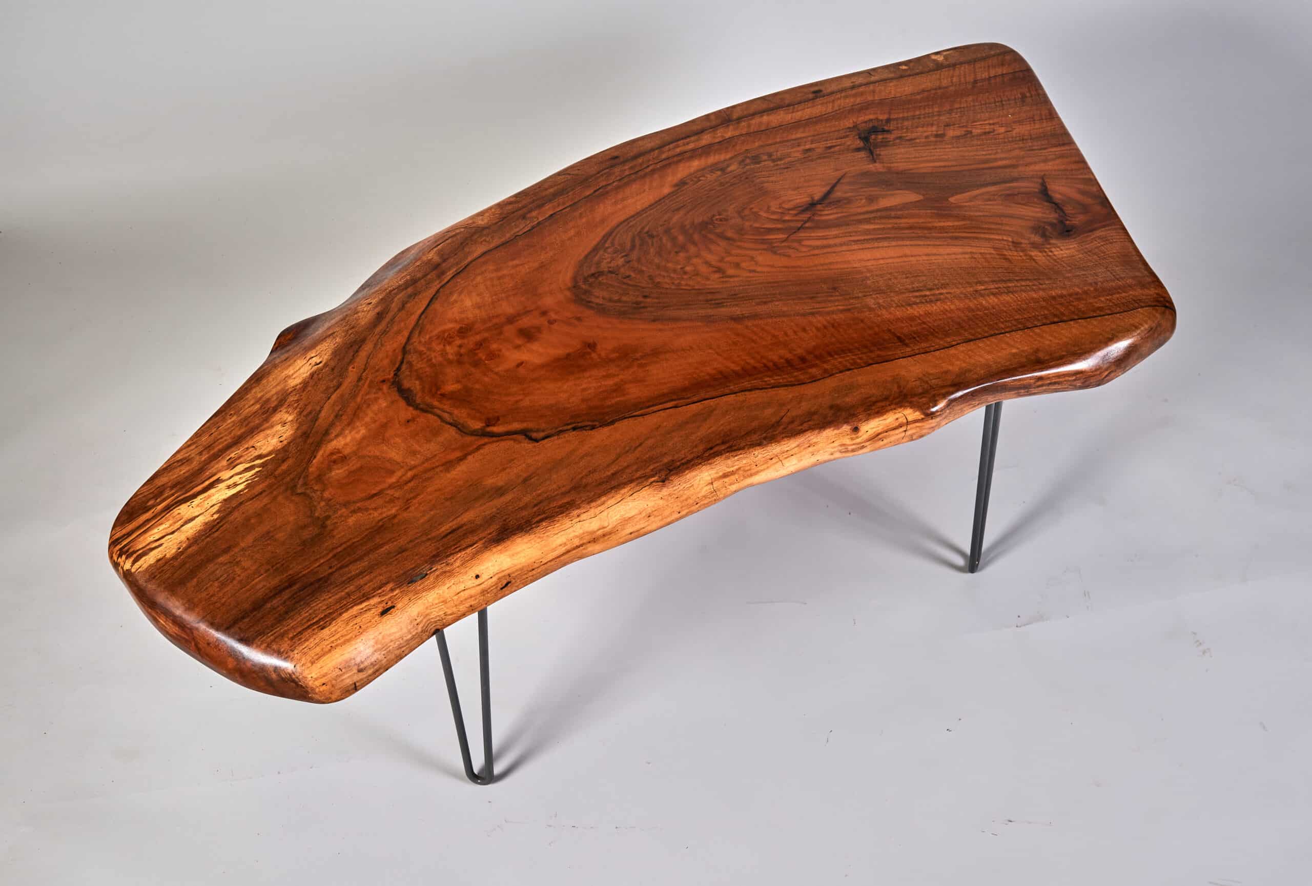 Available for sale this live edge black walnut coffee table. Made with uniquely figured solid black walnut slabs, the desk showcases why walnut is one of the most sought-after woods for furniture use.