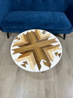 Bring elegance to your living space with the Nordic Star Table, a 28-inch round work of art. Its intricate wooden inlay pattern is set against a smooth white epoxy base, creating a stunning contrast that catches the eye. At 20 inches tall, this table is the perfect addition to any modern or Scandinavian-inspired interior. Designed for style and durability, its unique craftsmanship makes it a versatile centerpiece for your living room, bedroom, or office. Transform your space with timeless design.