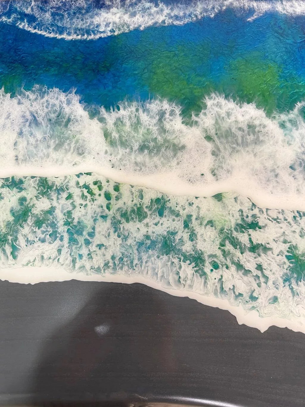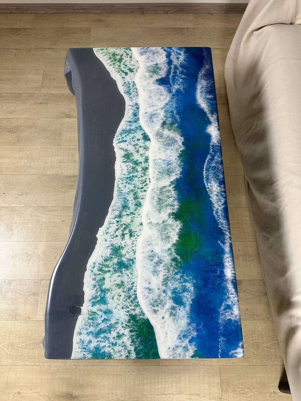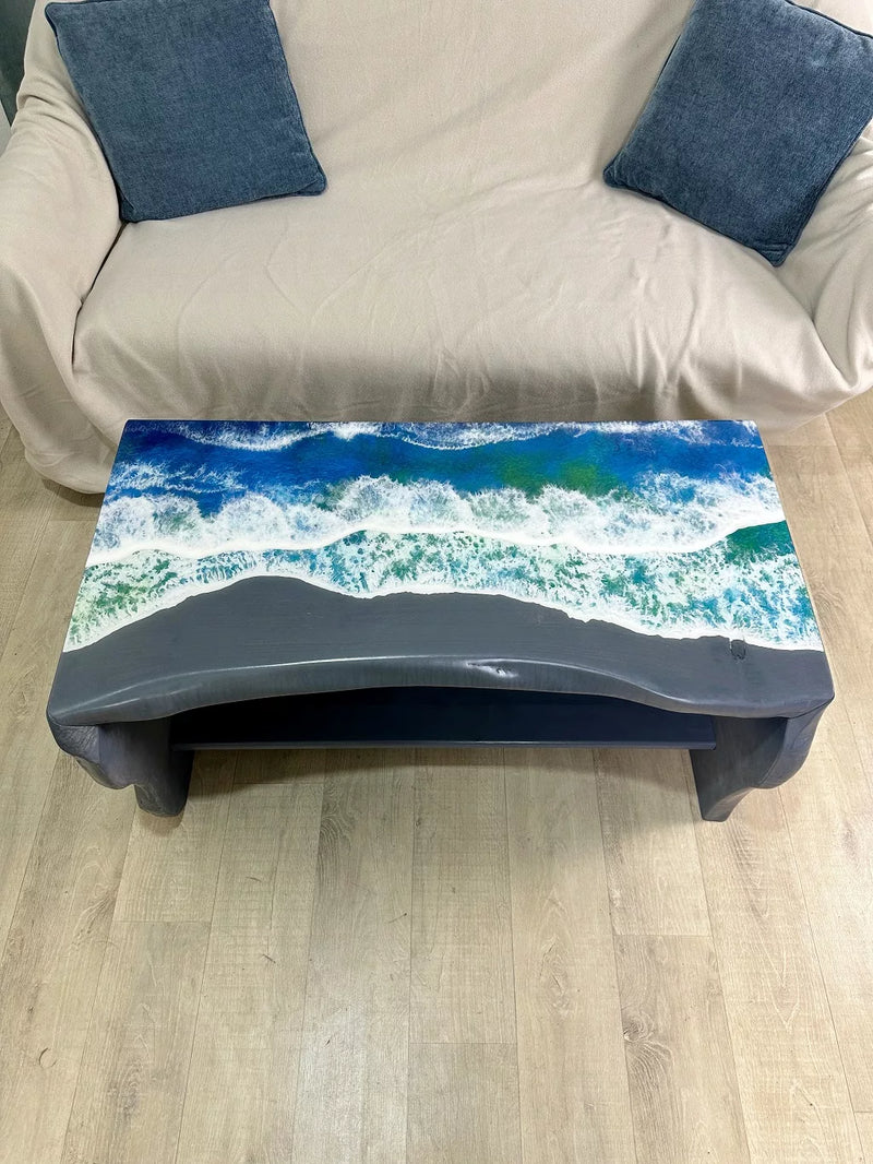 The Stormy Shore Waterfall Coffee Table features natural poplar wood paired with a unique grey resin and vibrant ocean wave design. The striking epoxy pattern mimics the dynamic energy of crashing waves against a rocky shoreline, while the grey resin base adds a modern touch. With its live-edge design and waterfall effect, this table is a perfect blend of nature-inspired beauty and contemporary style, making it an ideal centerpiece for any coastal or modern-themed living space.
