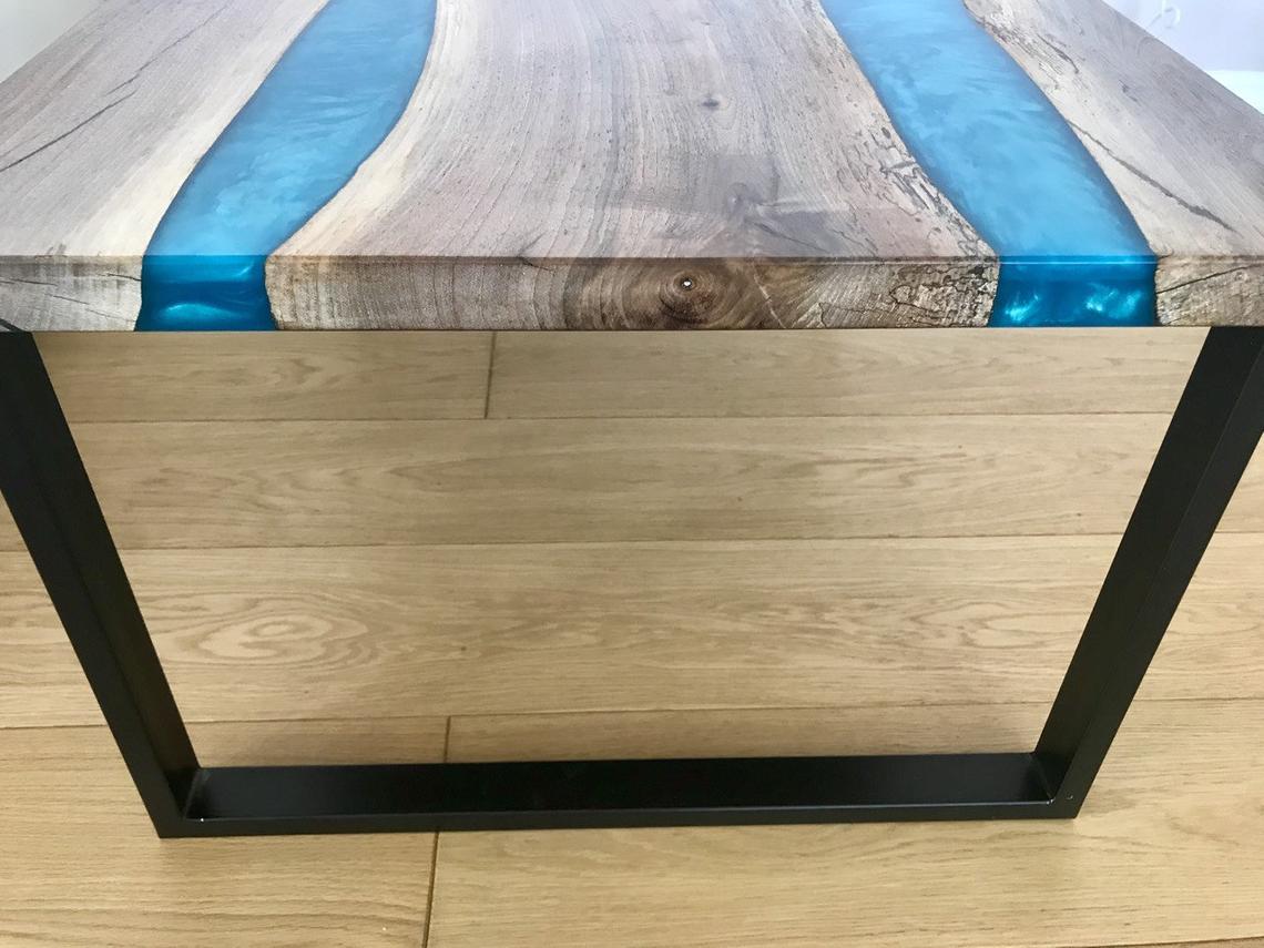 This Epoxy River Table features walnut wood and blue epoxy resin, complemented by a steel frame. The dimensions are fully customizable to suit your needs.